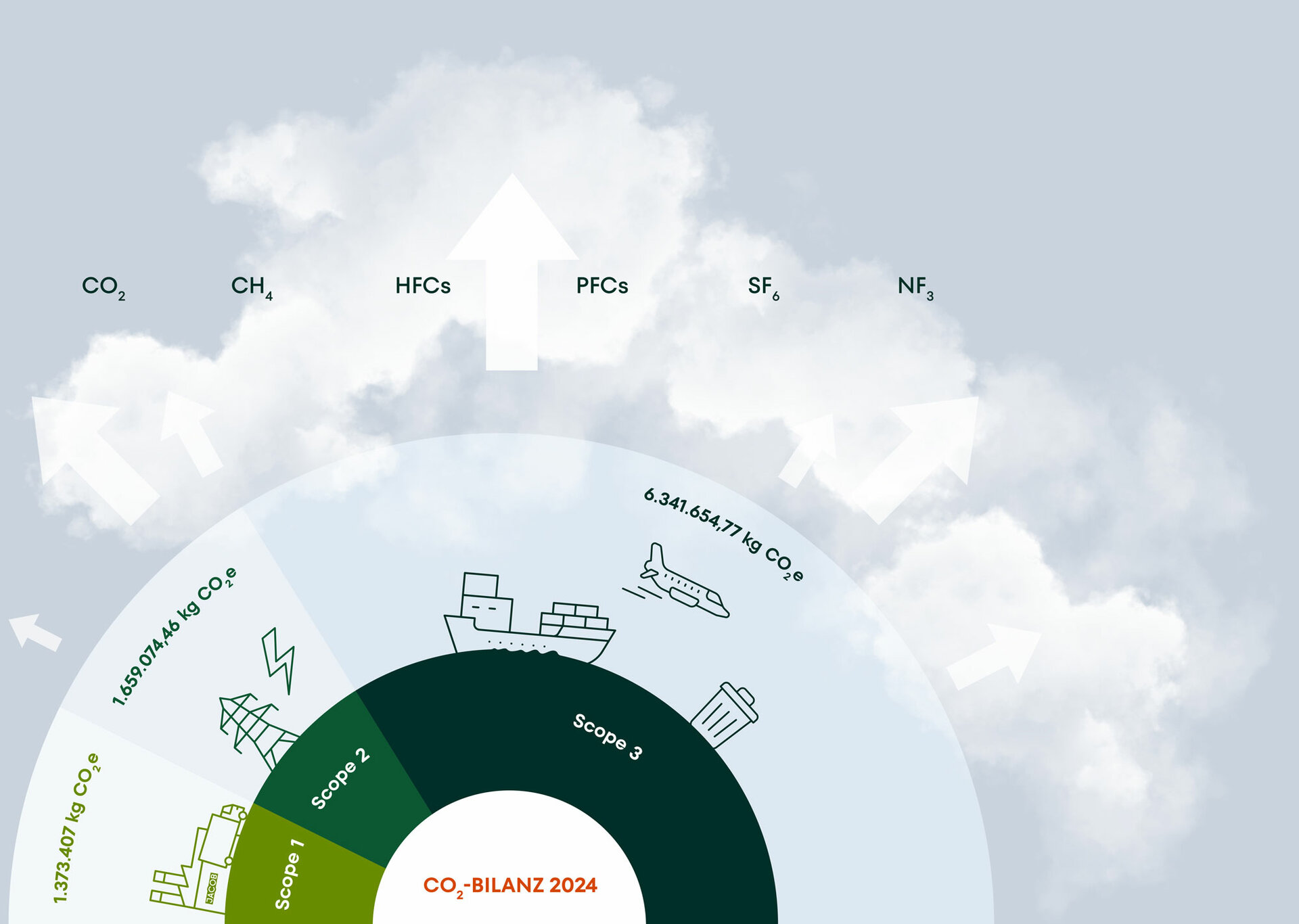 Wir erfassen unsere Emissionen nach dem international anerkannten Greenhouse Gas Protocol. Die Einteilung erfolgt dabei in drei Bereiche, sogenannte Scopes.
